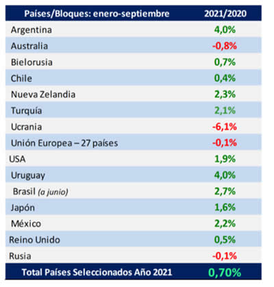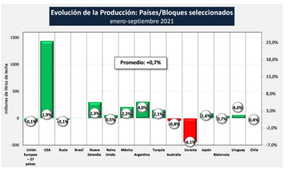 El Observatorio de la Cadena Láctea Argentina (OCLA) publicó datos que consideran a un grupo seleccionado de los principales países productores e importadores de leche, que representan alrededor del 60% de la producción mundial, y en el cual se observa un crecimiento de la producción de un 0,7% para enero-septiembre de 2021 respecto al mismo periodo año anterior.