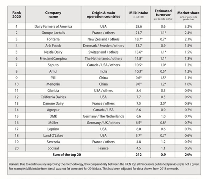 Desde que IFCN inició este ranking en 2007, ha habido muchos cambios debido a fusiones, adquisiciones, quiebras y crecimiento orgánico. Sin embargo, los desarrollos durante el año pasado han sido menores. Seis procesadores mejoraron su clasificación en 2020 y, curiosamente, todos tienen su sede en Europa. Al mismo tiempo, la mitad de los 20 principales tienen su sede en Europa, seis de ellos están ubicados en América del Norte, tres en Asia y uno en Oceanía. Sin embargo, los 3 principales procesadores de lácteos por consumo de leche se encuentran repartidos por todos los continentes: Dairy Farmers of America (Estados Unidos), Lactalis (Francia) y Fonterra (Nueva Zelanda).