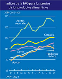 El índice de precios de los alimentos de la FAO se situó en diciembre de 2021 en un promedio de 133,7 puntos, es decir, 1,2 puntos (un 0,9 %) menos que en noviembre, pero todavía 25,1 puntos (un 23,1 %) más que en diciembre de 2020. Salvo en el caso de los productos lácteos, los valores de todos los subíndices englobados en el índice experimentaron descensos mensuales, siendo significativa la caída intermensual de los precios internacionales de los aceites vegetales y el azúcar. En lo que respecta a 2021 en su conjunto, el índice alcanzó un promedio de 125,7 puntos, lo que representa 27,6 puntos (un 28,1 %) más que el promedio del año 2020, con todos los subíndices situándose en un promedio marcadamente superior al de ese año.