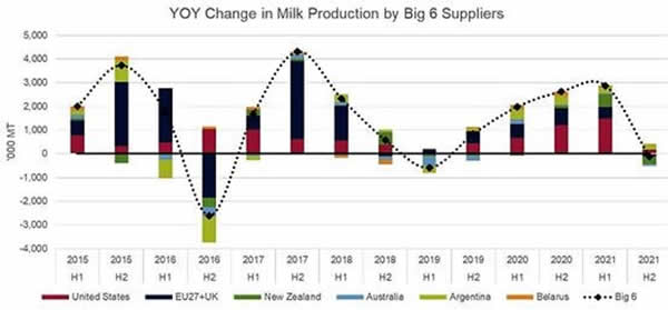 El suministro ajustado de leche fue la característica definitoria de los mercados lácteos mundiales en la segunda mitad de 2021.