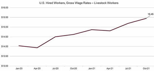 La aceleración se afianzó aún más en 2021 cuando las dificultades inducidas por la pandemia exacerbaron un mercado laboral ya ajustado. Según el USDA, la tasa salarial bruta para los trabajadores ganaderos (no exclusivamente lácteos) aumentó un 6 % en 2021 (enero-octubre), mientras que el precio promedio de toda la leche en 2021 solo aumentó un 1 % con respecto a 2020.