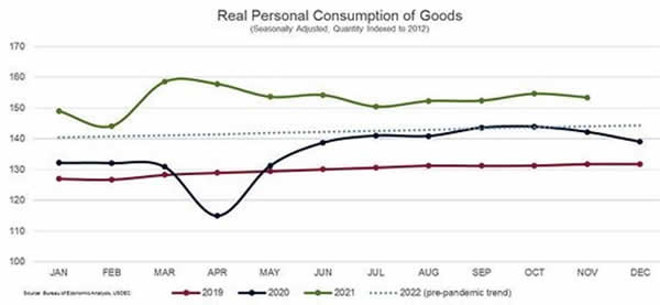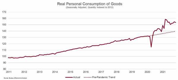 Comenzando con el gasto de los consumidores, la pandemia, combinada con las medidas de estímulo fiscal, empujó a los consumidores a comprar más bienes. Incluso teniendo en cuenta la inflación, la cantidad de bienes comprados por los consumidores se disparó en 2020 y se aceleró aún más en 2021 (como se ve en el gráfico a continuación). La mayor demanda de mercancías incrementó naturalmente el tráfico en los puertos.