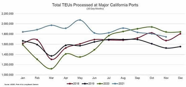 Claramente, los desafíos de la cadena de suministro, tanto en el interior como en los puertos, fueron un obstáculo importante para las exportaciones de productos lácteos de EE. UU. en 2021. Para este artículo, nos enfocamos en los problemas en los puertos. Los costos más altos, las reservas continuas, las tarifas inesperadas y los tiempos de entrega de exportación más lentos se debieron a la congestión en los puertos en 2021. En general, los principales puertos de la costa oeste fueron el epicentro de los retrasos, ya que la falta de equipo, mano de obra y espacio de descarga limitaron el volumen de negocios entrante y, en la salida, los transportistas optaron por los contenedores vacíos en lugar de las exportaciones de productos lácteos estadounidenses.
