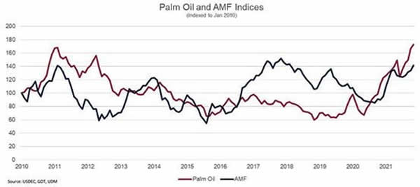 Hoy, los precios del aceite de palma también se están disparando, incluso en mayor medida que los precios de los lácteos. Los precios más altos de la palma (y también los precios más altos para otras alternativas lácteas) deberían equivaler a un incentivo reducido para que los fabricantes reformulen, incluso si los precios de los lácteos son elevados.