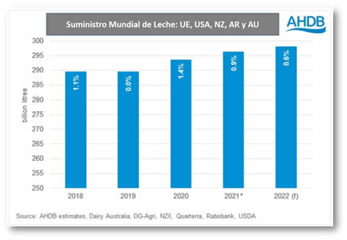 Las últimas estimaciones de la Junta de Desarrollo de la Agricultura y la Horticultura (AHDB) para 2022 sugieren un crecimiento anual del 0,6% en el suministro de leche a nivel mundial, equivalente a 1.800 millones de litros de leche adicionales. Esto sigue a un año de bajo crecimiento en 2021, con una producción de leche estimada que aumentó un 0,9 % para el año.