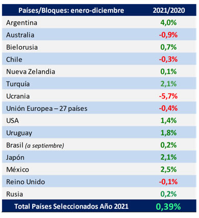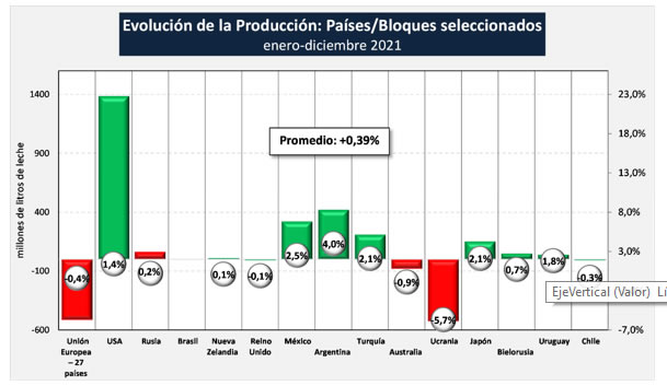 El Observatorio de la Cadena Láctea Argentina (OCLA) publicó los últimos datos referidos al cierre de la producción mundial de 2021, considerando a un grupo seleccionado de los principales países productores e importadores de leche, que representan alrededor de un 60% de la producción mundial, y en el cual se observa un incremento de la producción de un 0,39% entre enero- diciembre de 2021 respecto al mismo periodo año anterior.