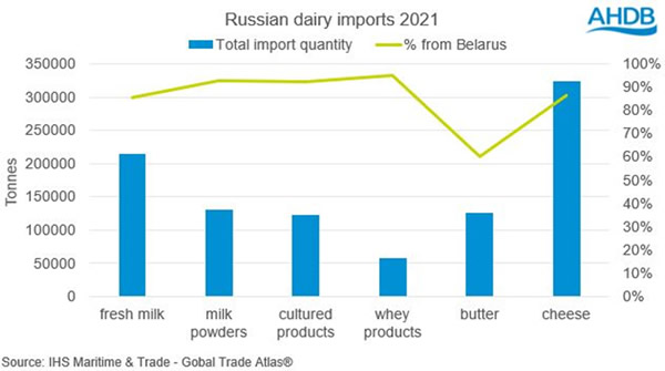 A la mayoría de las naciones occidentales, incluida la UE-27 y el Reino Unido, se les prohibió comerciar productos lácteos (así como muchos otros productos agrícolas) con Rusia desde 2014, cuando el país dirigido por Vladimir Putin se anexionó Crimea. Rusia ahora comercia casi exclusivamente con Bielorrusia, que es la responsable del 85% de las importaciones totales de lácteos del país ruso.