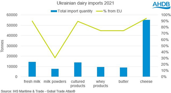 El Reino Unido realiza un comercio mínimo con Ucrania, exportando menos de 300 toneladas de productos lácteos en 2021.