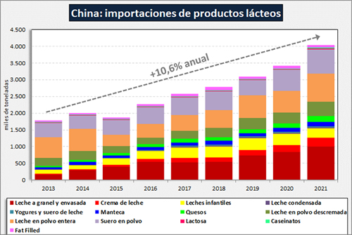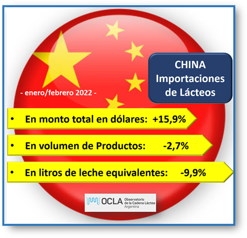 En el período enero-febrero de 2022 las importaciones de productos lácteos de China, cayeron en volumen de productos en un 2,7 y un 9,9 en litros de leche equivalentes, pero crecieron en valor un 15,9%.