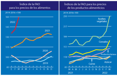 » El índice de precios de los alimentos de la FAO* se situó en marzo de 2022 en un promedio de 159,3 puntos, es decir, 17,9 puntos (un 12,6 %) más que en febrero, con un salto gigante que lo llevó a un nuevo nivel, el más elevado desde su creación en 1990. El último aumento obedece a los nuevos máximos históricos de los subíndices de los aceites vegetales, los cereales y la carne, mientras que también subieron notablemente los del azúcar y los productos lácteos.