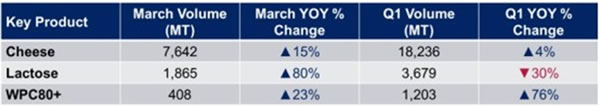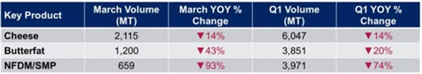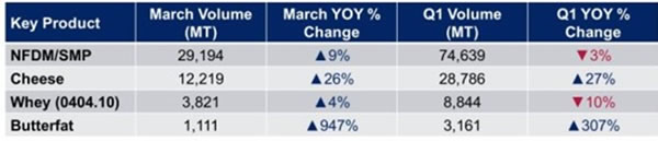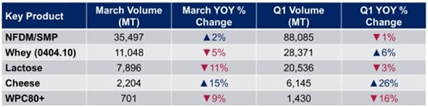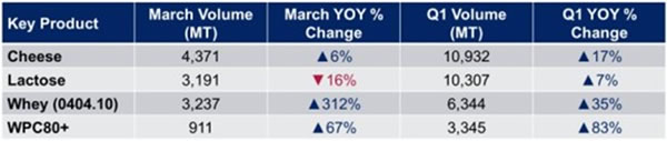 Las exportaciones de productos lácteos de EE. UU. en marzo casi igualaron el récord de 2021, ya que las exportaciones totales en sólidos de leche equivalente (MSE) disminuyeron menos del 1%, una caída de solo 2005 toneladas métricas (TM) MSE.