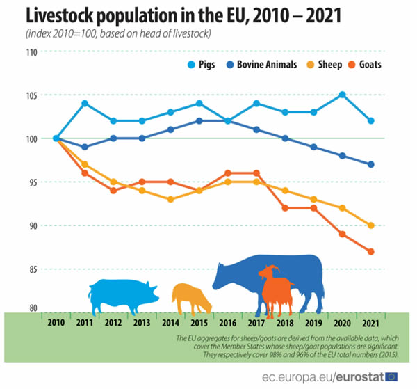Eurostat explicó que entre 2010 y 2021 ha habido fluctuaciones en la población de las cuatro principales especies ganaderas.