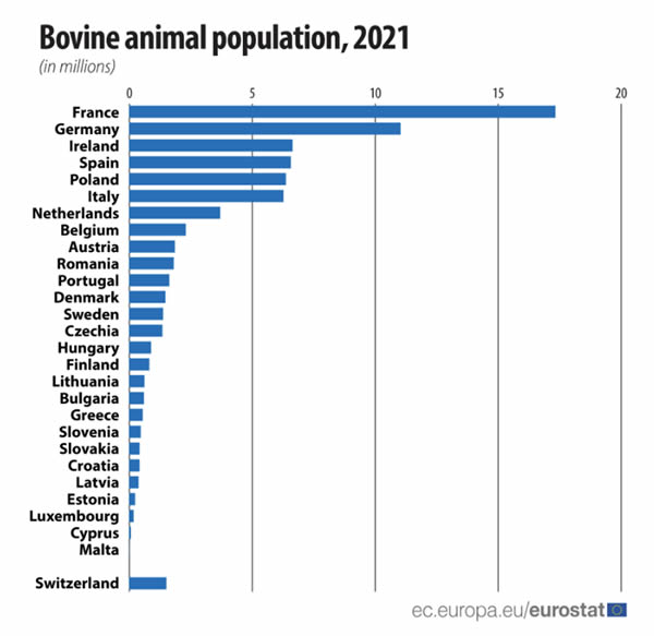 Irlanda cuenta con el 9% de la población bovina total de la Unión Europea, según un informe difundido el martes 17 de mayo por Eurostat .