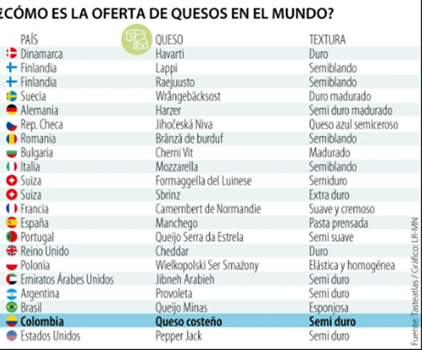 Estados Unidos produce más de 600 tipos de queso, en donde su variedad también se encuentran los de orígen europeo, como cheddar y mozzarella, y aquellos lugareños de este territorio, como pepper jack, midnigth blue y allegreto, según cifras del mercado norteamericano.