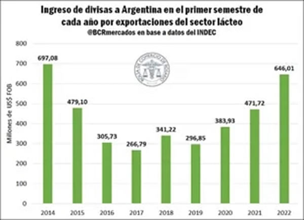 Las exportaciones de productos lácteos viven un buen momento por la mejora de los precios internacionales. En el primer semestre de 2022, de acuerdo a los datos brindados por la Bolsa de Comercio de Rosario (BCR), alcanzó en valor los US$646,01 millones. Es el valor más alto desde 2014, cuando entraron US$697,08 millones. Según el relevamiento, contra igual período de 2021 hubo una mejora del 36,9%.