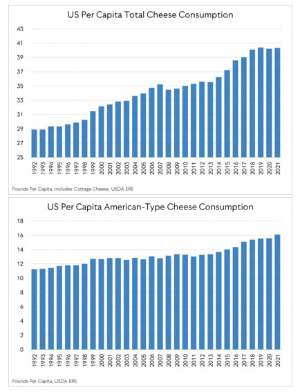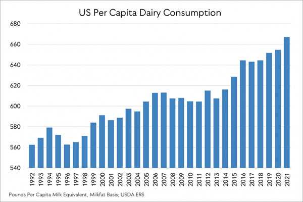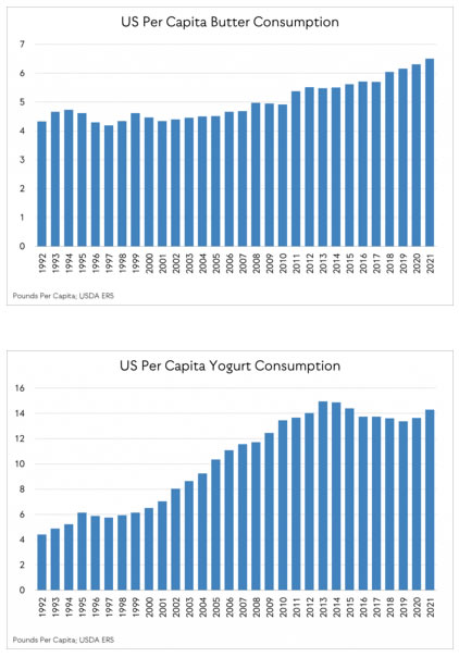 Solo en la última década: el consumo interno per cápita de queso aumentó un 13%; el consumo de mantequilla per cápita aumentó un 18%; el consumo de yogur per cápita aumentó un 2%. En general, los datos de ERS muestran que el consumo per cápita de productos lácteos estadounidenses en todos los productos aumenta constantemente cada año, con un aumento del 4 % en 2021 en los últimos cinco años, del 9 % en los últimos 15 años y del 19 % en los últimos 30 años.