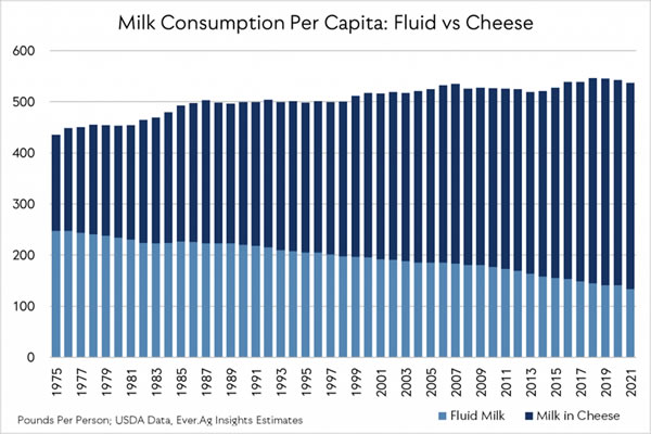 Los datos publicados muestran que el consumo per cápita de lácteos creció 12.4 libras por persona con respecto al año anterior, continuando una tendencia de crecimiento de casi 50 años que comenzó en 1975 cuando el USDA comenzó a rastrear el consumo anual de leche, queso, mantequilla y todo lo demás lácteos.