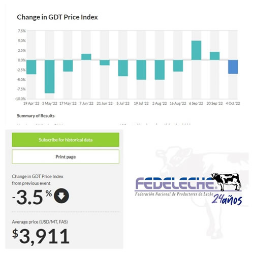 La primera subasta de octubre (N° 317) del remate de Fonterra, celebrada este martes 04 de octubre, rompió la tendencia alcista que encadenaban los eventos de septiembre, cerrando el índice de precio con una caída del 3,5% % respecto a la subasta anterior, situándose en US$ 3,911 la tonelada.