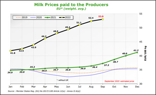 Alemania, principal productor de la Unión Europea, ve como el precio de la leche en el noveno mes de 2022 se ha situado en los 56,19 euros/100 kg, lo que significa un ascenso del 49,8% sobre el año pasado cuando era de 37,51.