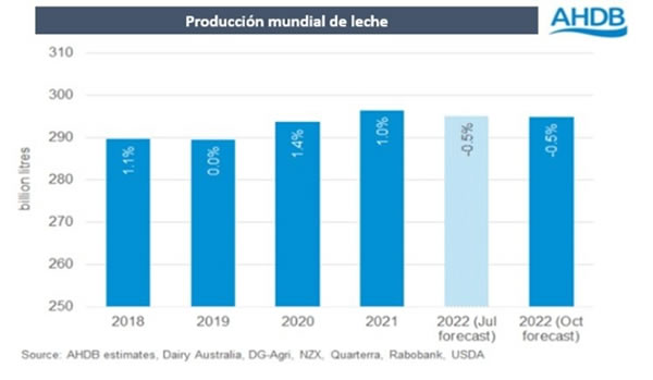 Según las últimas previsiones, que recoge la consultora AHDB, la producción mundial de leche de vaca disminuirá un 0,5% en 2022 en las principales regiones productoras. Esto coincide con las expectativas de principios de año, aunque se han producido cambios en las perspectivas individuales.