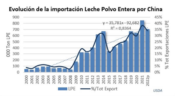 Tomando un poco de perspectiva, miremos le evolución de importaciones en los últimos 22 años. En el siglo XX prácticamente las compras al exterior eran nulas. En 2008 con la adulteración de leche en polvo con melamina (en un muy rústico intento de mejorar el análisis de proteína de la leche que generó algunas muertes y 300.000 niños afectados con variada gravedad) la población se volcó a los productos importados, preferencia que aún subsiste. Luego la curva es marcadamente creciente, con la caída del 2015 causada por una restructuración de la economía doméstica importante y la del corriente año 2022 con la política Covid Cero con fuerte impacto en la actividad económica. Estimamos que la tendencia de las importaciones que presenta el gráfico se mantendrá en el tiempo: China necesita leche.