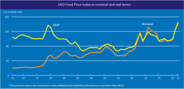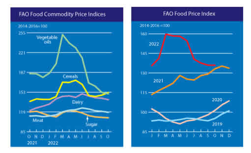 El índice de precios de los alimentos de la FAO , que rastrea los cambios mensuales en los precios internacionales de una canasta de productos alimenticios comúnmente comercializados, promedió 135,9 puntos durante el mes de octubre, insignificantemente por debajo de su nivel en septiembre. Con la última actualización, el índice se situó un 14,9 % por debajo de su máximo histórico registrado en marzo de 2022, mientras que se mantuvo un 2,0 % por encima de su nivel en octubre de 2021.