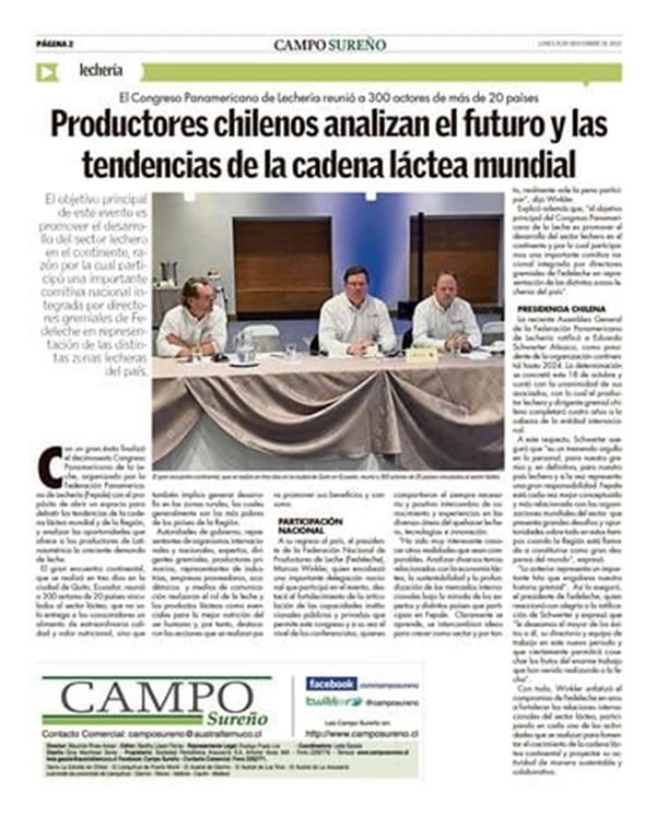 A su regreso al país, el presidente de la Federación Nacional de Productores de Leche (Fedeleche), Marcos Winkler, quien encabezó una importante delegación nacional que participó en el evento, destacó el fortalecimiento de la articulación de las capacidades institucionales públicas y privadas que permite este congreso y a su vez el nivel de los conferencistas, quienes compartieron el siempre necesario y positivo intercambio de conocimiento y experiencias en las diversas áreas del quehacer lechero, tecnologías e innovación.