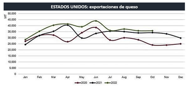 Las exportaciones de queso de EE. UU. en octubre aumentaron un 4% ( +1.589 toneladas) con ganancias generalizadas en varios mercados. Los envíos a Japón aumentaron un 39% (+1260 toneladas), los volúmenes a Medio Oriente/África del Norte aumentaron un 67% (+1029 toneladas) y las exportaciones a México aumentaron un 12% (+952 toneladas). Si bien las exportaciones de queso de EE. UU. con relación al año anterior, han aumentado durante 16 meses consecutivos, las ganancias en el futuro pueden ser más desafiantes.