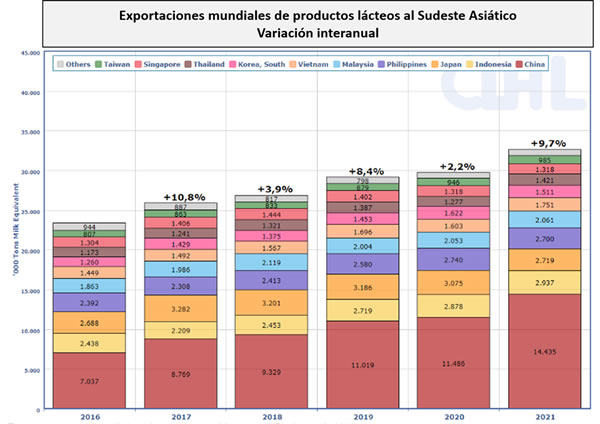 Los mercados combinados de Indonesia, Malasia, Singapur, Filipinas, Tailandia y Vietnam están experimentando uno de los crecimientos más grandes del mundo en la demanda de productos lácteos. Se espera que para 2030 en estos seis países del sudeste asiático, las importaciones alcancen casi 19 millones de toneladas de equivalentes de leche frente a los 12,9 millones de toneladas de 2020, superando las de China. El aumento en la renta per cápita también determina el cambio en la dieta tradicional, con mayores preferencias de los consumidores por los beneficios de los productos lácteos considerados más adecuados para el desarrollo de los niños y la salud de los ancianos. Esto lleva a un aumento en el consumo que los productores locales no pueden sostener.