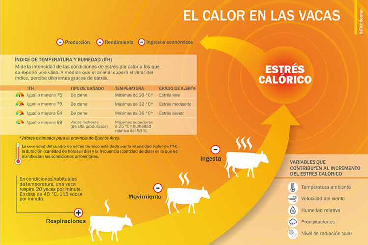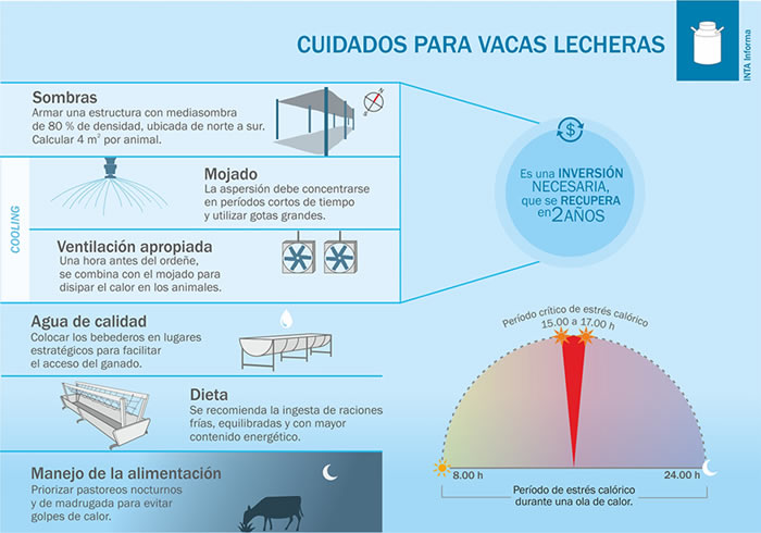 Las elevadas temperaturas del verano, cada año, plantean el desafío de realizar un manejo adecuado para minimizar el impacto en las diversas actividades productivas. Frente a este contexto, desde el INTA brindan una serie de recomendaciones para reducir el riesgo por estrés calórico en el ganado lechero. Entre las pautas de manejo se destacan contar con sombras artificiales en los corrales de espera, así como en los potreros. En paralelo, es importante realizar un proceso de enfriamiento del animal.