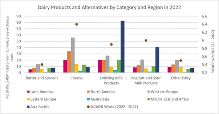 Se espera que los productos de leche agria, incluido el kéfir, sean los de más rápido crecimiento a nivel mundial, con una CAGR prevista esperada del 4% en el valor de las ventas minoristas. Además, los mercados emergentes están generando el crecimiento más rápido para el queso y, en particular, se espera que Asia Pacífico experimente una CAGR del 7% durante el período de pronóstico, en gran medida impulsado por el fuerte crecimiento en China.