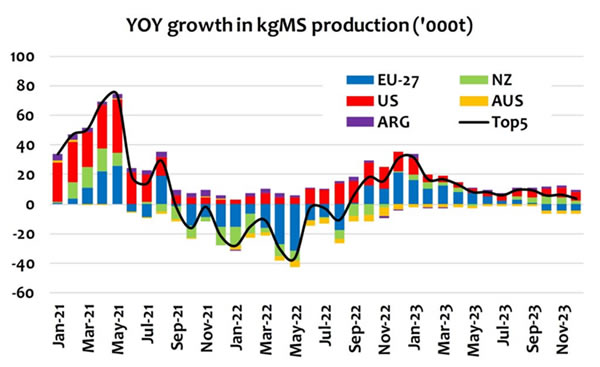 El ritmo de la recuperación de la demanda de leche en polvo entera ha tenido y seguirá teniendo un enorme impacto en el equilibrio de la producción de Nueva Zelanda. Hasta la fecha, ha sido más lento de lo esperado, aumentando las existencias disponibles de leche en polvo entera y manteniendo la presión a la baja sobre los valores de la leche en polvo entera. Los productores de Nueva Zelanda intentarán igualar la demanda de leche en polvo entera con sus opciones de mezcla de productos, pero esperamos que mantengan la producción de leche desnatada en polvo y queso por encima de los niveles anteriores a 2022, en un momento en que la producción de la UE y los Estados Unidos está bajo presión.