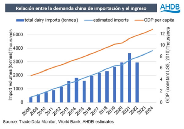 Históricamente ha habido una fuerte relación entre el crecimiento económico de China (medido por el PBI per cápita) y su nivel de importaciones de productos lácteos. Tanto es así, que la comparación de las dos tendencias puede dar una indicación de las importaciones esperadas y los riesgos potenciales en torno a la acumulación de existencias.