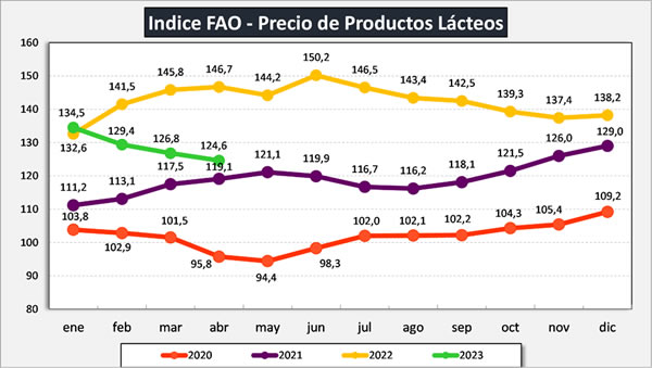 El índice de precios de los productos lácteos de la FAO se situó en abril en un promedio de 124,6 puntos, es decir, 2,2 puntos (un 1,7%) menos que en marzo y 22,1 puntos (un 15,1%) por debajo del nivel de hace un año. En abril, los precios internacionales de las leches en polvo cayeron por décimo mes consecutivo, fundamentalmente debido a las repercusiones de la persistente atonía de la demanda mundial de importaciones.