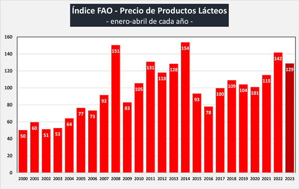 Por su parte el gráfico siguiente muestra el valor promedio del primer cuatrimestre de cada año del índice de precios de los lácteos de FAO de los últimos 24 años (2000-2023):