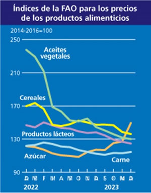 El índice de precios de los alimentos, que hace un seguimiento de las variaciones mensuales de los precios internacionales de los productos básicos más comercializados, se situó un 19,7% por debajo del nivel de abril de 2022, pero todavía un 5,2% más alto que el mismo mes de 2021.