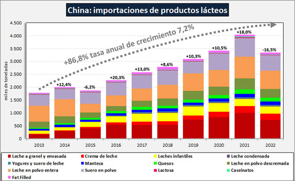 Las importaciones de productos lácteos de China venían creciendo significativamente entre 2013-2021 (salvo en la crisis de 2015) a una tasa acumulativa del 10,6% anual, con la caída del 16,5% en 2022 la tasa se redujo al 7,2% anual. De cualquier manera, sigue siendo China el gran motor de la demanda de lácteos en el mercado internacional.