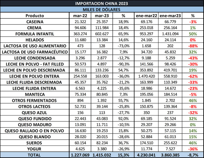 Varios productos presentaron una importante caída en el mes de marzo de 2022, sobre todo leches en polvo enteras y fluidas en general y los sueros que siempre implican un volumen importante, incrementaron su volumen. En el acumulado, las compras de leche en polvo (normalmente un tercio del valor total importado), cayeron en volumen un 44,8% y el otro producto principal de las compras chinas (7% en valor, por su menor precio unitario pero elevado en volumen), los sueros, que también cayeron en 2022, se recuperaron en este año, y crecieron en volumen un 56%.