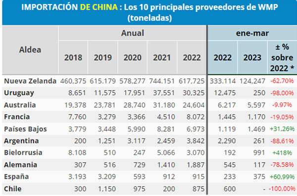 China es el principal importador de Leche en Polvo Entera y su principal proveedor es Nueva Zelanda quien ostenta el 92% de participación de ese producto en el gigante asiático en lo que va de 2023 (93% en 2022).