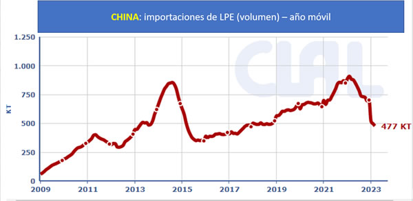Las compras de China en el mercado internacional ascendieron a unos 20.000 millones de litros de leche equivalentes en el año 2021, algo así como el 25% de lo que se comercializó en ese mercado (excluyendo las ventas intra Unión Europea), de allí que su comportamiento es muy relevante para la determinación de los precios. En el año 2022 una caída del 17,1% en las ventas mundiales en China que tiene el 25% de las compras, implica una baja de más del 4% del total mundial, cuando este mercado sube normalmente un 3% anual. Esta muy vinculada la relación entre la caída de las compras de China (entre otras causas) y el nivel actual de los precios internacionales en los últimos meses (precios disponibles y futuros), como contraposición la caída de producción en muchos países lecheros, atemperó la baja de precios que podría haber sido superior. Esta situación continuó en el primer trimestre de 2023, de allí su incidencia en precios mas bajos en el mercado internacional.