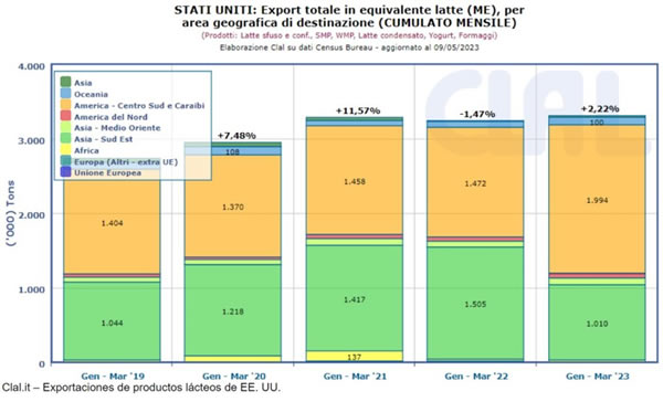 En el primer trimestre de 2023 las exportaciones lácteas estadounidenses aumentaron 5,4% en cantidad y +4,7% en valor. Después de un período positivo de tres años (2020-2022), la exportación de productos lácteos estadounidenses continúa por tracción de la leche en polvo descremada, quesos (particularmente rallados o en polvo), proteína de suero, lactosa para uso farmacéutico y leche en polvo entera.