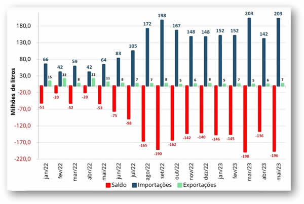 Según datos difundidos el pasado martes (06/06/2023), por la Secretaría de Comercio Exterior (SECEX), la balanza comercial láctea arrojó un resultado en equivalente de leche de unos 7 millones de litros para exportaciones y 203 millones de litros para importaciones.