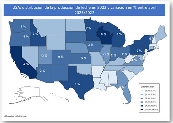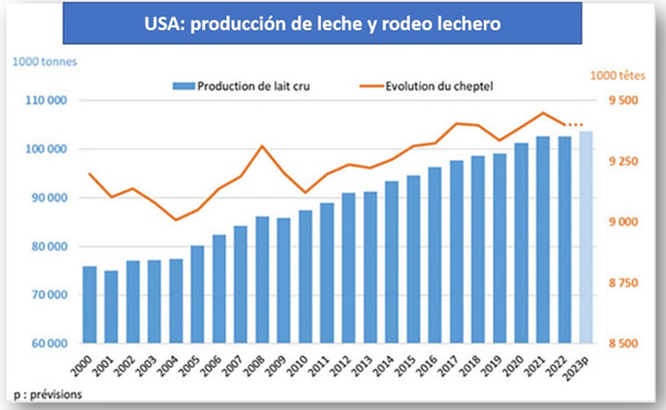 La producción láctea de EE. UU. se mantuvo estable en 2022 en 102,7 ton. (un 0,1% más que en 2021), un poco más baja en la primera mitad (-0,8%) en comparación con la segunda mitad (+1%). “La producción láctea de EE. UU. ha aumentado de manera constante desde 2010 y debería seguir aumentando, pero un poco menos que en años anteriores.