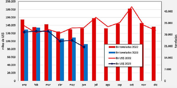 La variación intermensual de las exportaciones fue de -15,0% en volumen y de -16,2% en valor (jun/23 vs. may/23). La variación interanual fue de -29,9% en volumen y -36,3% en valor (jun/23 vs. jun/22). En ambas comparaciones se puede visualizar la caída en volúmenes y en precios.