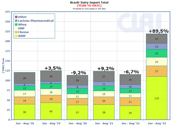 Las importaciones brasileñas de lácteos, en Equivalente de Leche, aumentaron más del doble en los primeros siete meses de 2023, en comparación con el mismo período de 2022. Los principales aumentos están asociados principalmente a los polvos: entre enero y julio, las importaciones de LDP crecieron en 74.700 Toneladas (+211,7%), de LDP en 10.700 Toneladas (+98,7%), y de Suero en Polvo en 8.000 Toneladas (+66%).