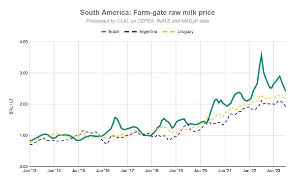 La mayor entrada de importaciones de productos lácteos se vio favorecida por la baja eficiencia del sector productor brasileño, caracterizado por muchos pequeños productores no especializados que afrontan costes más elevados en comparación con los productores de los países vecinos. Además, esos países, gracias al MERCOSUR, se benefician de un acuerdo comercial que incluye el libre comercio. Esta competencia está generando una tendencia a la baja del precio de producción brasileño, reduciendo los márgenes de los productores locales y empujando a muchos de ellos a abandonar el sector.