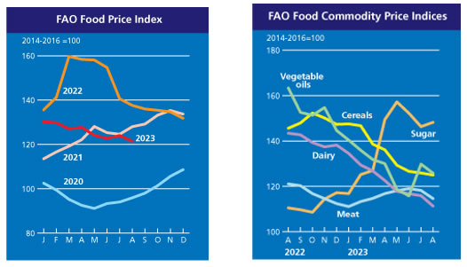 De igual manera, el índice de precios de los alimentos* de la FAO (FFPI) promedió 121,4 puntos en agosto de 2023, 2,6 puntos (2,1 %) menos que en julio, revirtiendo el repunte registrado el mes pasado y empujando el índice hasta 38,3 puntos (24,0 %) por debajo de su máximo alcanzado. en marzo de 2022. La caída reflejó caídas en los índices de precios de los productos lácteos, aceites vegetales, carne y cereales, mientras que el índice de precios del azúcar aumentó moderadamente.