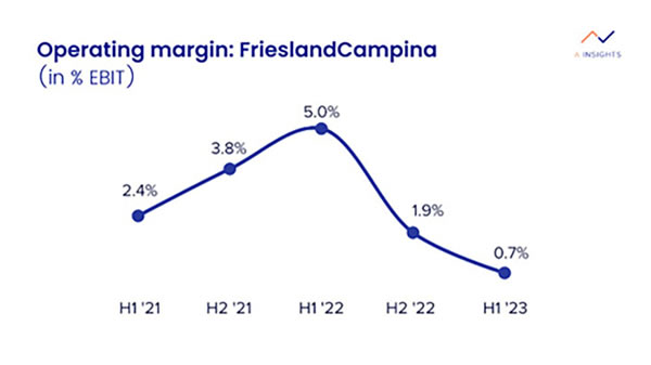 La situación empeora por un retraso en el ajuste de los precios de la leche, lo que obligó a las empresas a vender las existencias producidas cuando los costos de los insumos eran más altos con los precios actuales más bajos de las materias primas. Esto ha afectado negativamente a los márgenes de beneficio de la industria, como destaca FrieslandCampina , cuyo margen operativo (EBIT) cayó del 5% al 0,7% en el período comprendido entre el primer semestre de 2022 y el primer semestre de 2023 ( Figura 1 ).