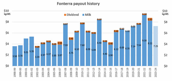 La semana pasada, y antes de los últimos aumentos de precios globales, el gigante lácteo Fonterra elevó su pronóstico de precio de la leche para los proveedores agrícolas en 50 centavos a unos efectivos 7,25 dólares por kilogramo de sólidos lácteos. (Fonterra pronostica un rango de precios y el nuevo pronóstico para la temporada 2023-24 es de un rango de $6,50 – $8,00 por kgMS, con un nuevo punto medio de $7,25 por kgMS, un aumento de 50 centavos).
