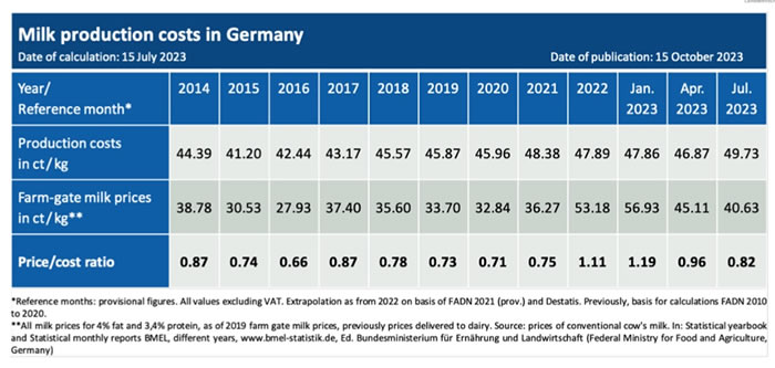 La relación precio/coste ilustra hasta qué punto los precios de la leche cubren el coste de producción. En julio de 2023, los precios de la leche no cubrían los costes de producción. El déficit era del 18%.
